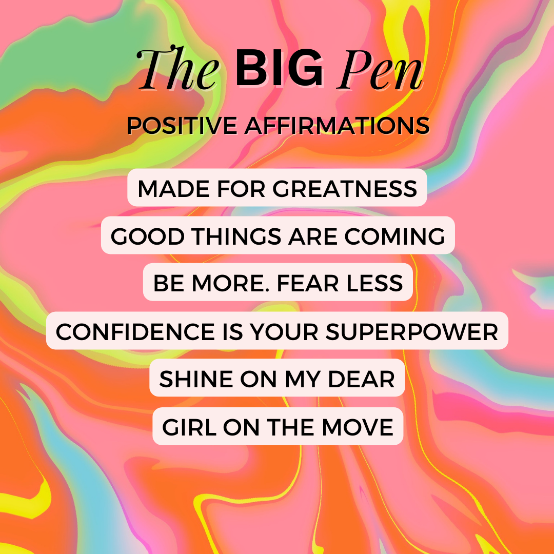The BIG pen is a ballpoint pen with black ink that features 2 windows that rotate through six messages of empowerment, encouragement and positivity.
